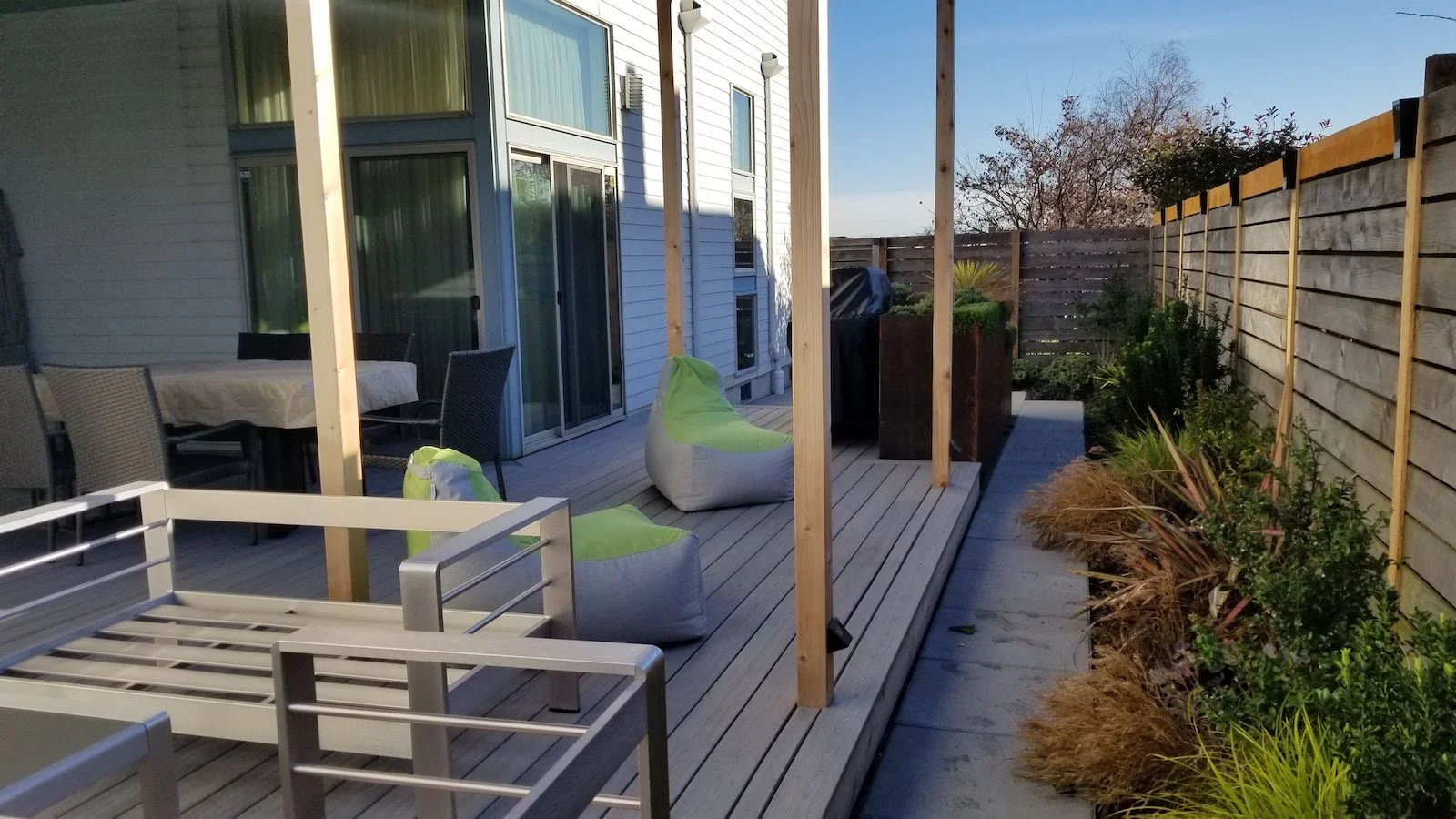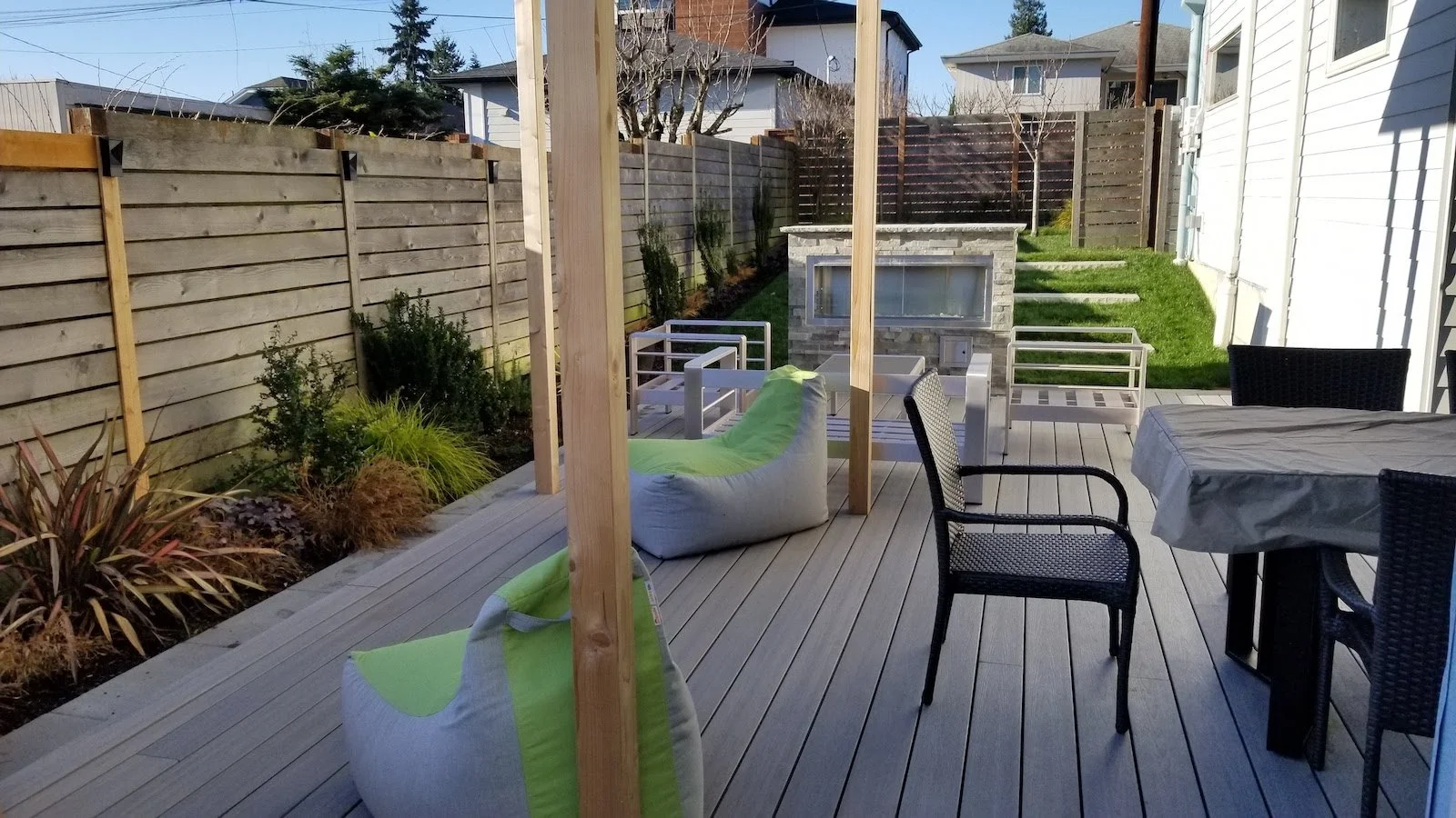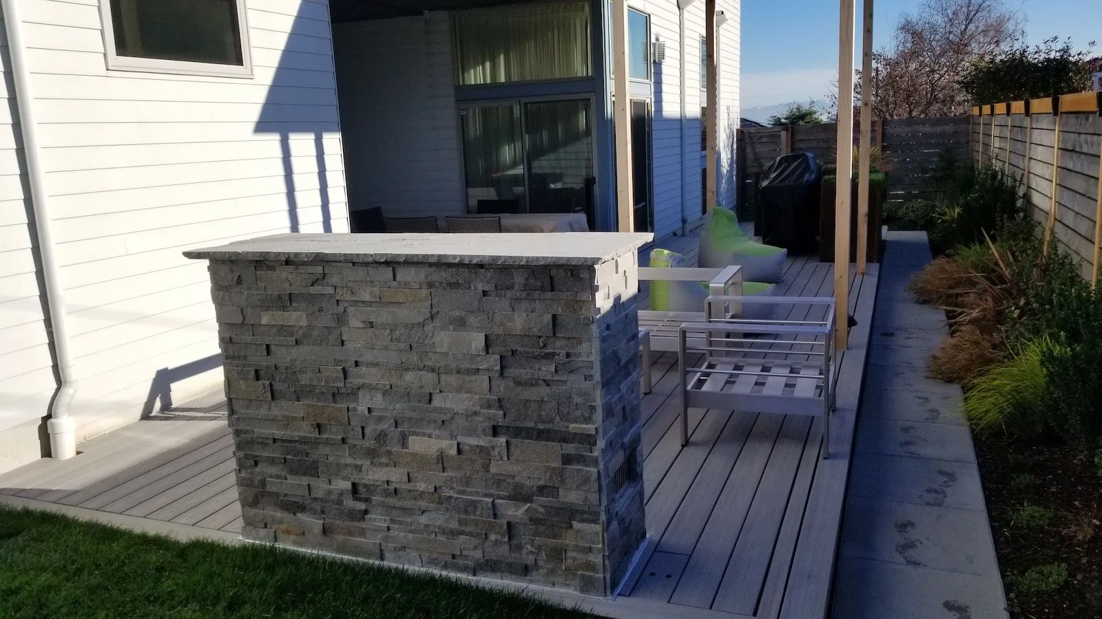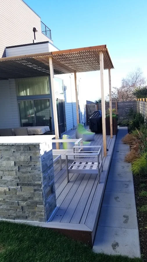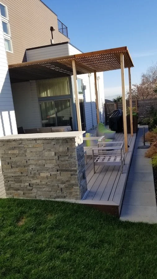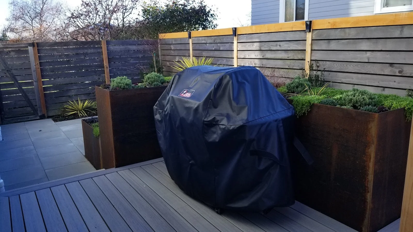 This project showcases a custom gas firepit with stone veneer, providing a cozy gathering spot for outdoor enjoyment. The outdoor covered grilling area ensures year-round usability, while multiple levels of sleek steel planters enhance the landscape’s appeal. Architectural 24”x24” concrete slab paving creates a cohesive and modern aesthetic, making this outdoor space both functional and stylish.