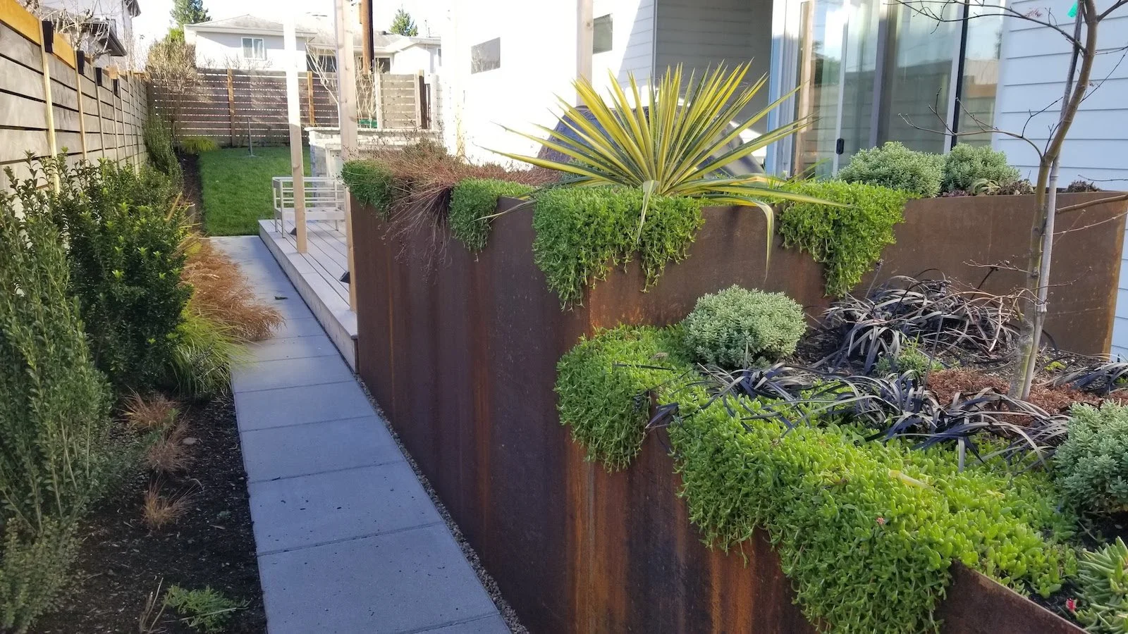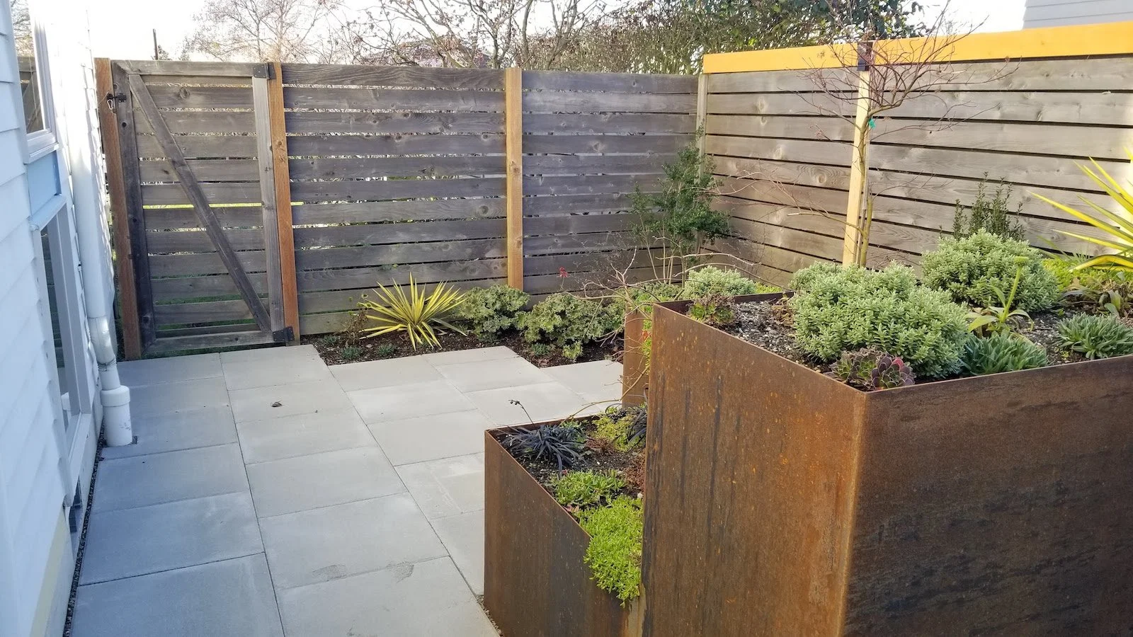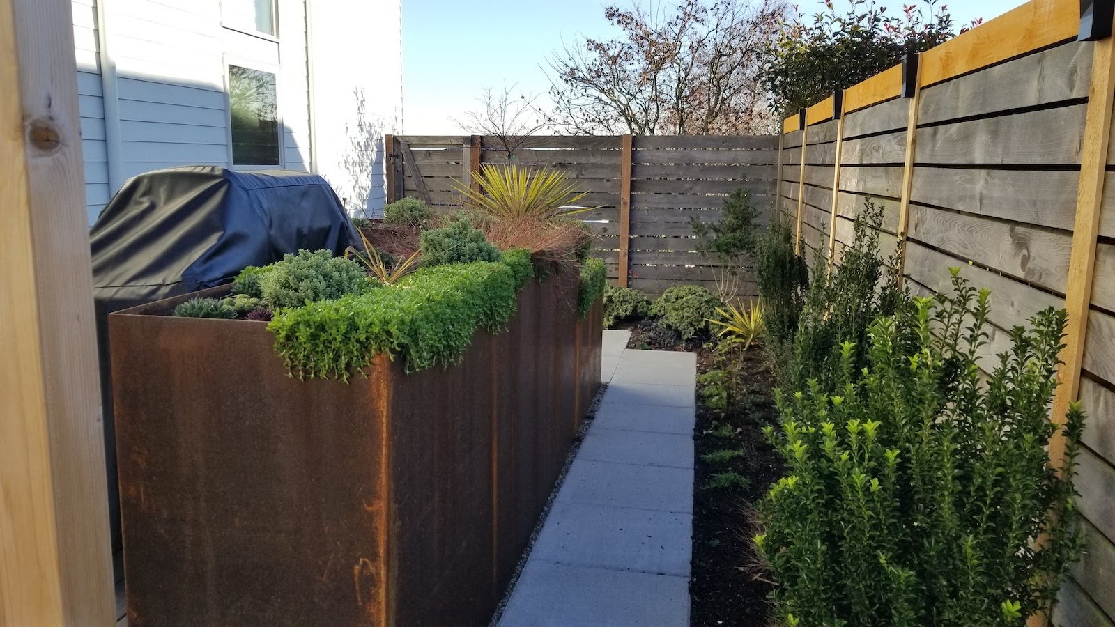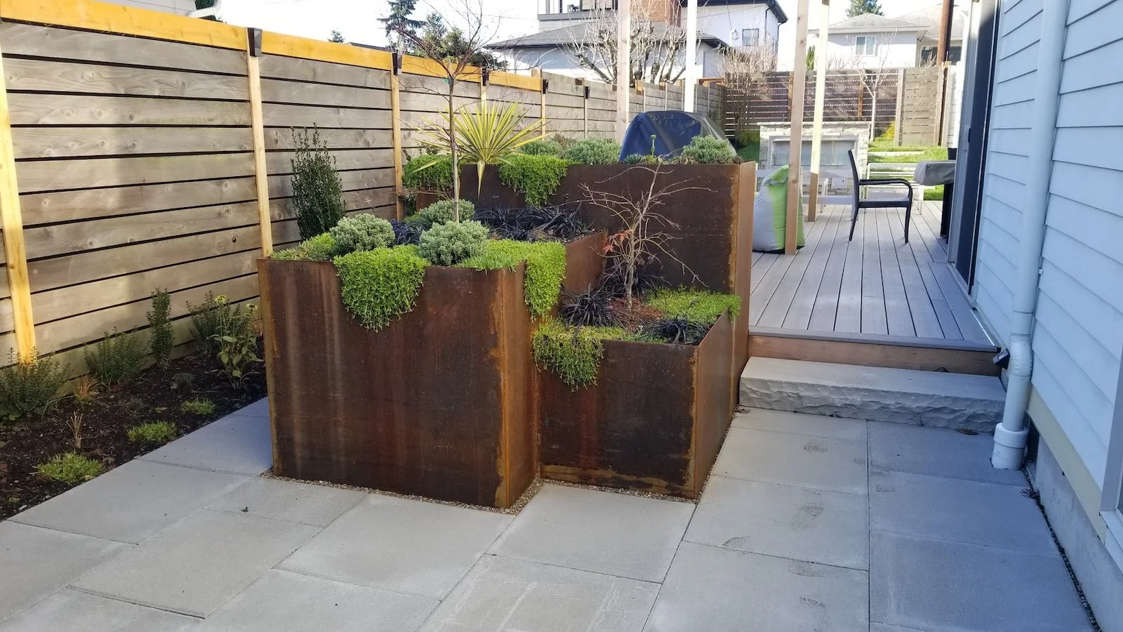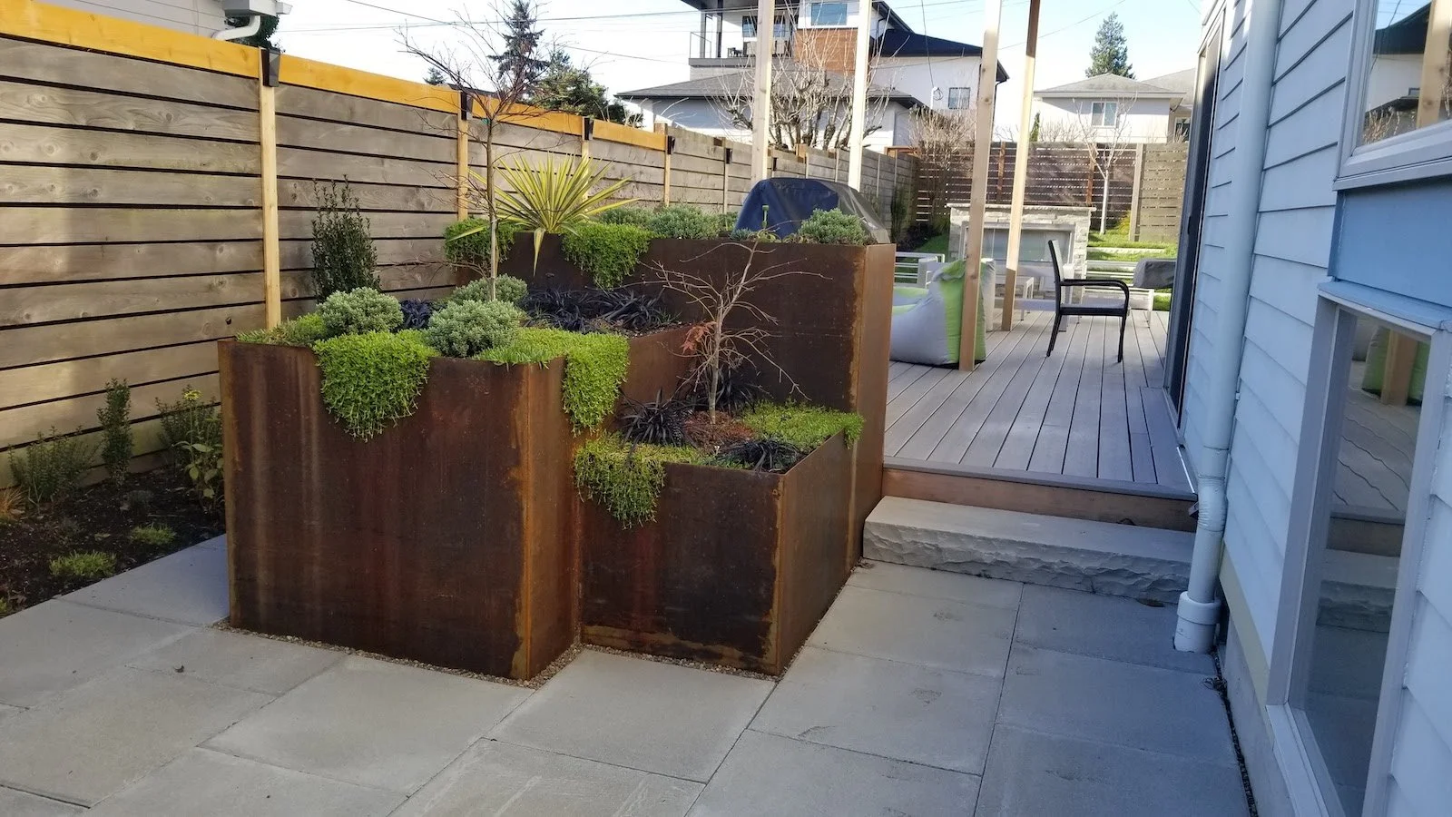 Outdoor Gas Fireplace & Multi-Level Steel Planters